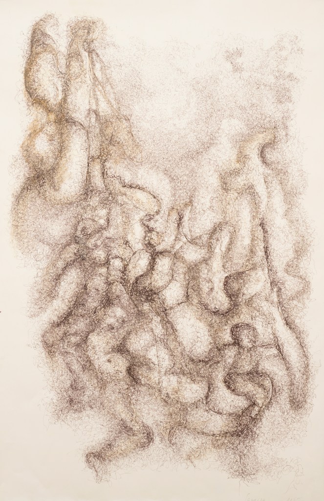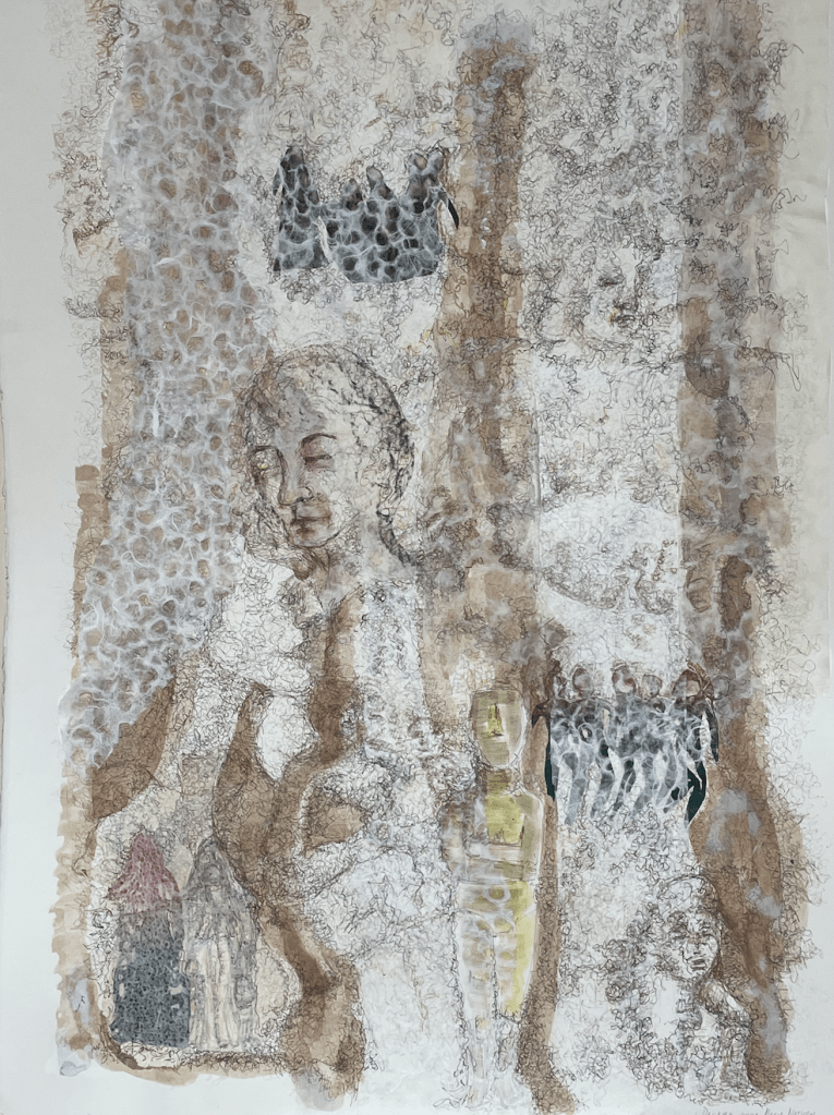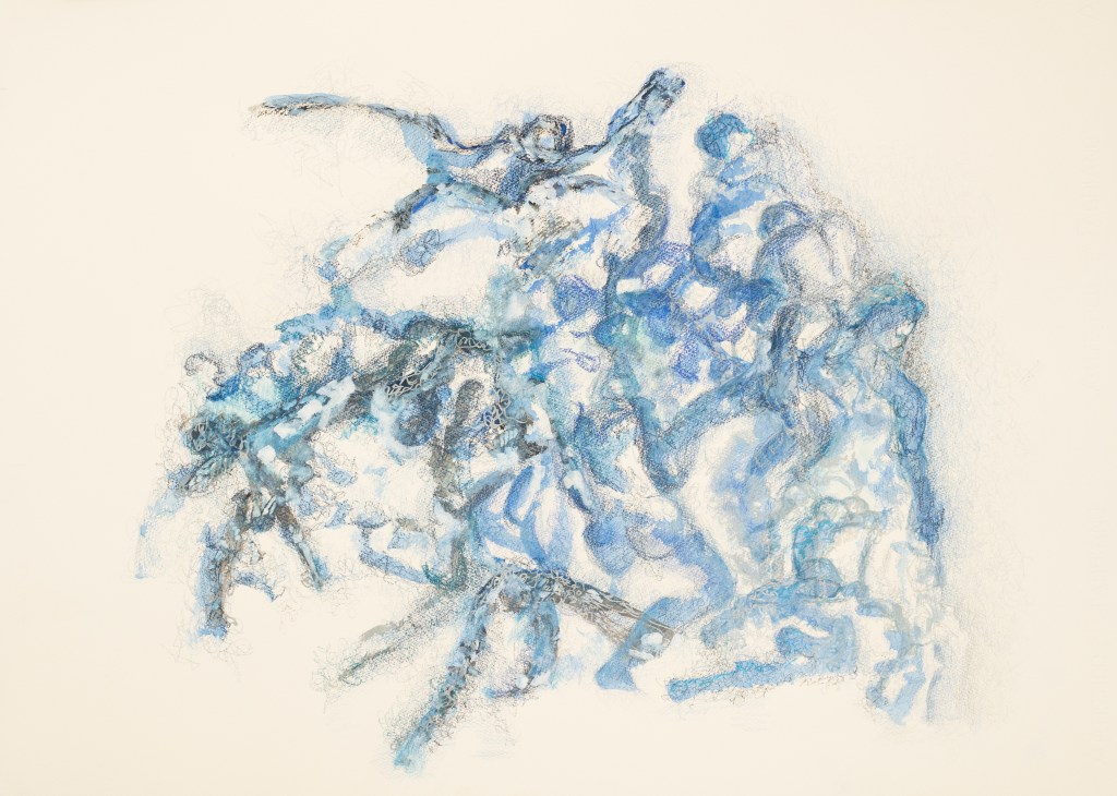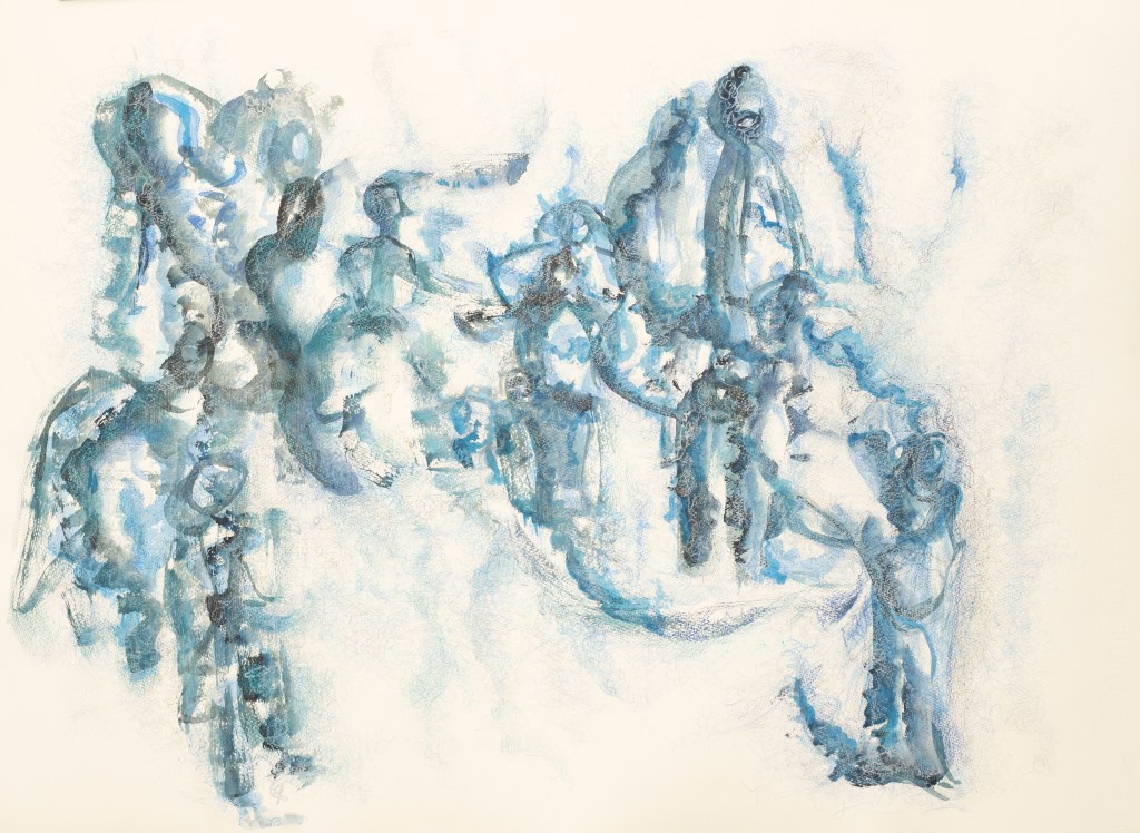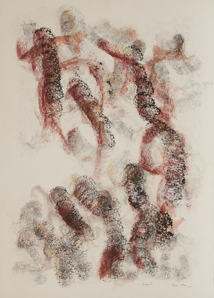 A whole new sweetness, 70 x 100 cm, hand-printed marks with egg tempera and pigments on mulberry paper, 2022Limitless web, 75 x 108 cm, hand-printed marks with ink and details with oil colour pencils on paper, 2022Rehearsal, 75 x 108 cm, hand-printed marks with ink and details with oil colour pencils on paper, 2022if things were simply left as splendid, 75 x 108 cm, wash, pen and ink, oil-colored pencils on paper, 2022No room for no more people, 75 x 108 cm, wash, pen and ink, oil-colored pencils on paper, 2022The other half of a yellow sun (after Chimamanda Ngozi Adichie’s novel), 75 x 108 cm, wash, pen and ink, oil-colored pencils and roll-on print on paper, 2022Le retour de la magie, 78 x 108 cm, ink, soaked charcoal, egg tempera and collage on paper, 2021Capoeira, 79 x 105 cm, ink on paper, 2020Rythms, 73 x 103 cm, ink on paper, 2021Dreaming, 78 x 108 cm, ink, oil color pencils, collage on paper, 2021And they keep going, 78 x 108 cm, ink, oil color pencils, collage on paper , 2021Rhapsody in blue 1, 55 x 75 cm, ink on paper, 2021Rhapsody in blue 2, 55 x 75 cm, ink on paper, 2021