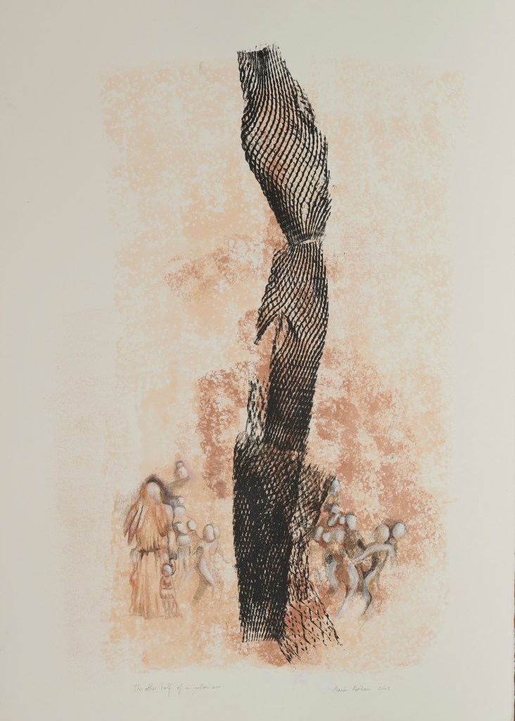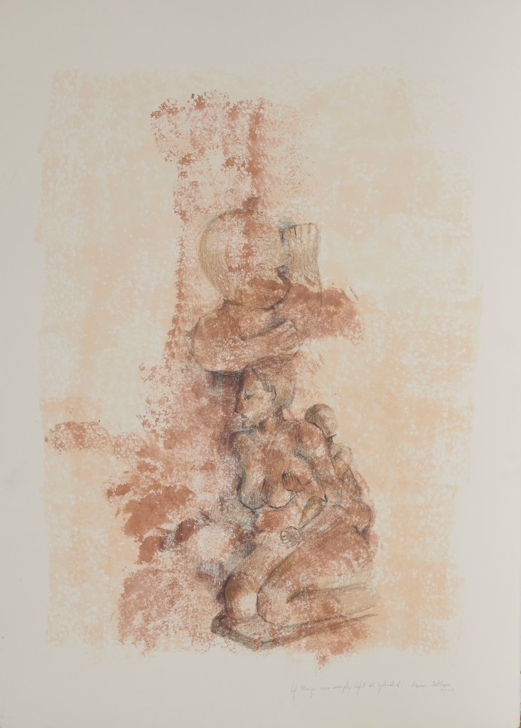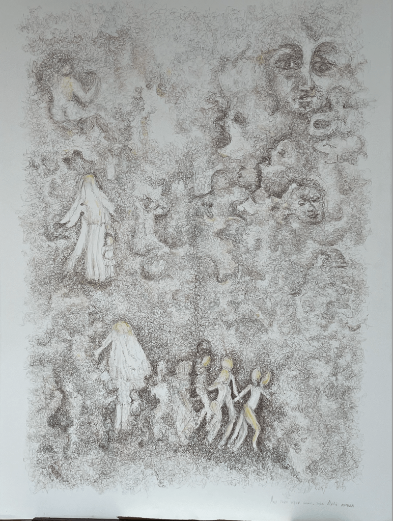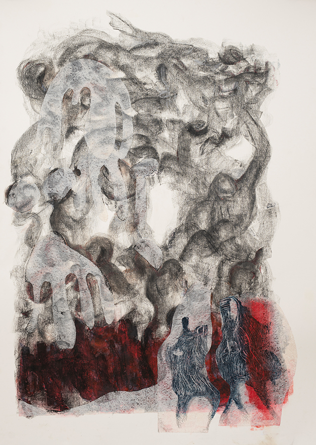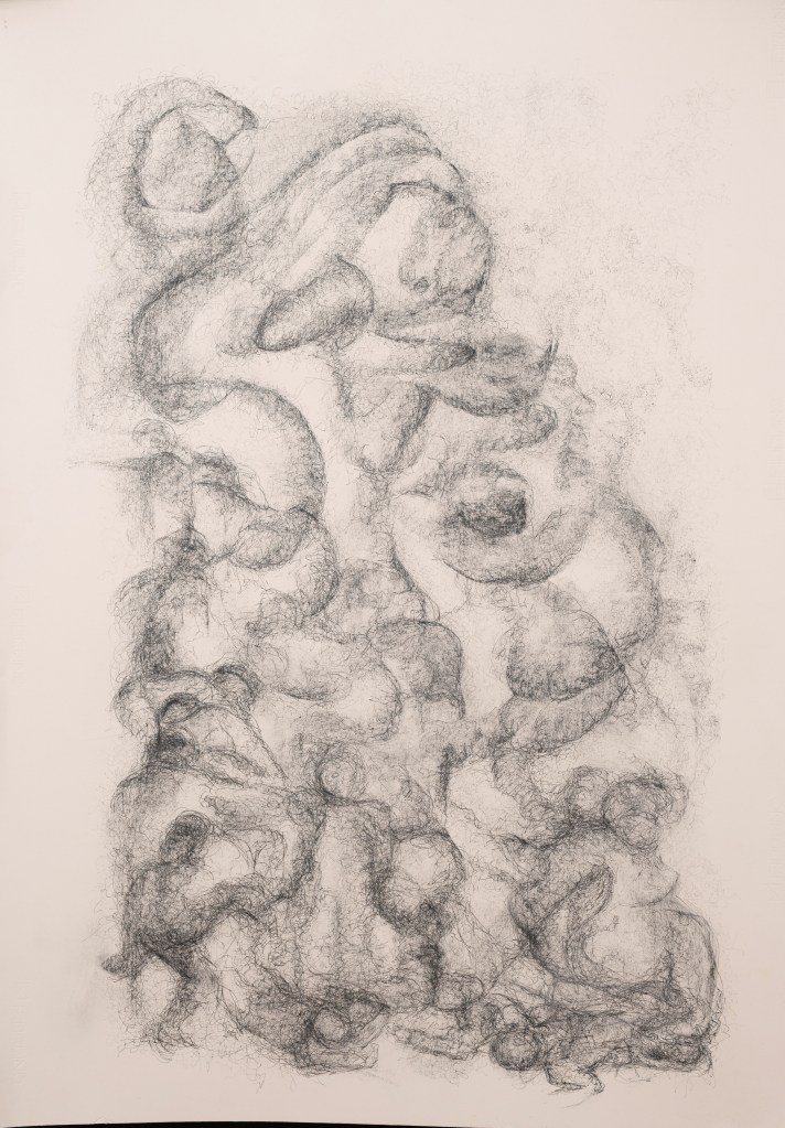A whole new sweetness, 70 x 100 cm, hand-printed marks with egg tempera and pigments on mulberry paper, 2022Limitless web, 75 x 108 cm, hand-printed marks with ink and details with oil colour pencils on paper, 2022Rehearsal, 75 x 108 cm, hand-printed marks with ink and details with oil colour pencils on paper, 2022if things were simply left as splendid, 75 x 108 cm, wash, pen and ink, oil-colored pencils on paper, 2022No room for no more people, 75 x 108 cm, wash, pen and ink, oil-colored pencils on paper, 2022The other half of a yellow sun (after Chimamanda Ngozi Adichie’s novel), 75 x 108 cm, wash, pen and ink, oil-colored pencils and roll-on print on paper, 2022Le retour de la magie, 78 x 108 cm, ink, soaked charcoal, egg tempera and collage on paper, 2021Capoeira, 79 x 105 cm, ink on paper, 2020Rythms, 73 x 103 cm, ink on paper, 2021Dreaming, 78 x 108 cm, ink, oil color pencils, collage on paper, 2021And they keep going, 78 x 108 cm, ink, oil color pencils, collage on paper , 2021Rhapsody in blue 1, 55 x 75 cm, ink on paper, 2021Rhapsody in blue 2, 55 x 75 cm, ink on paper, 2021