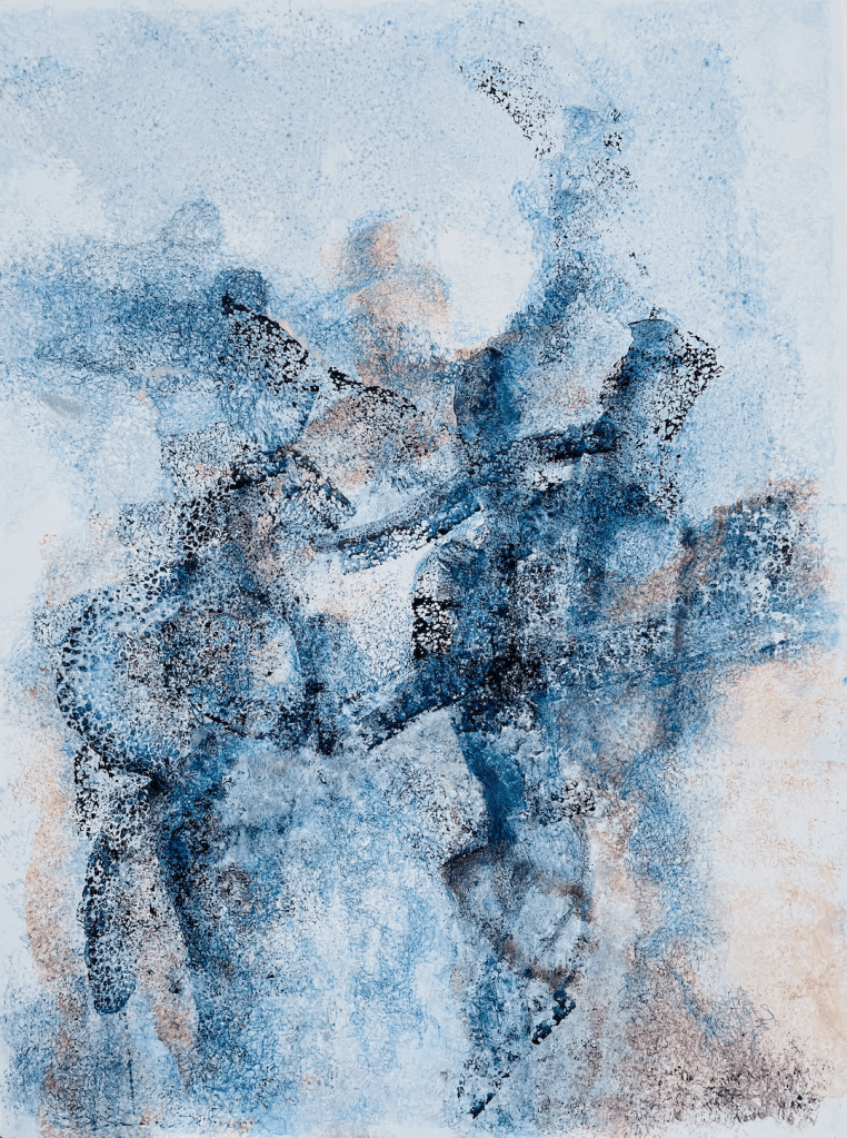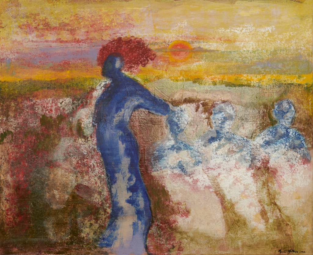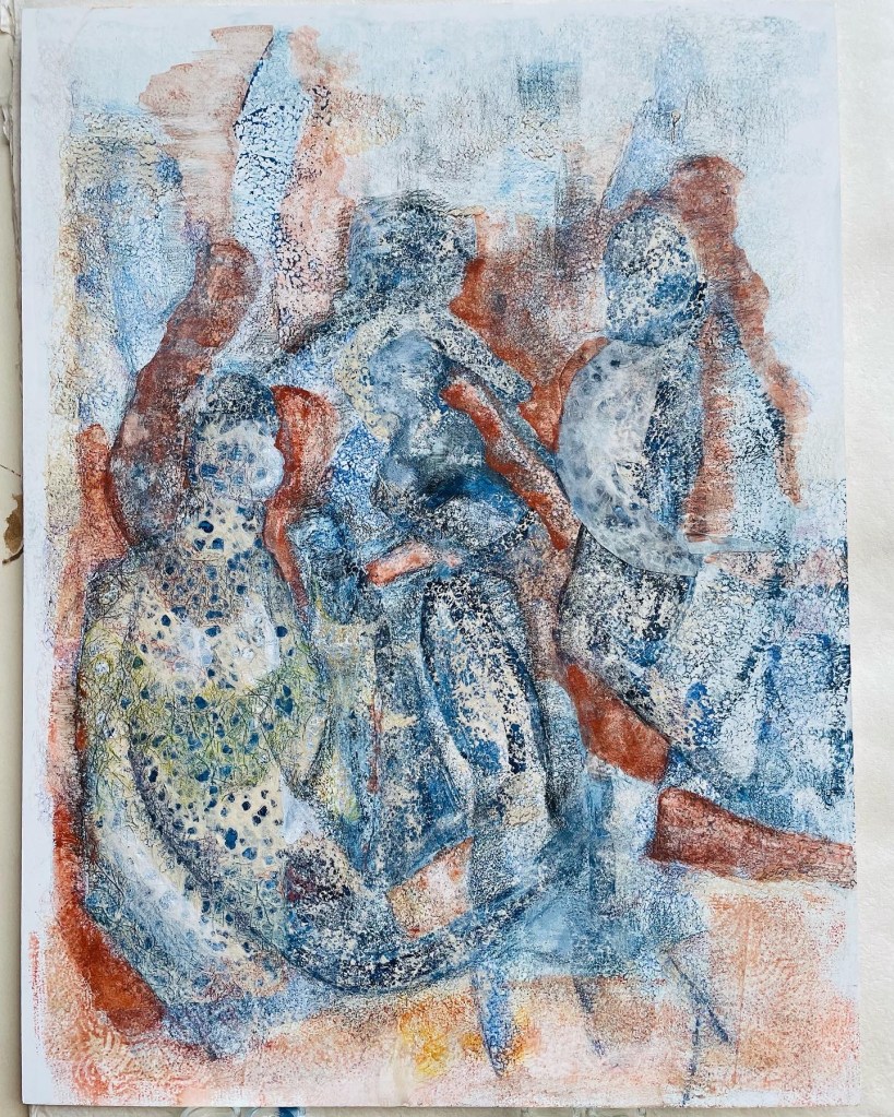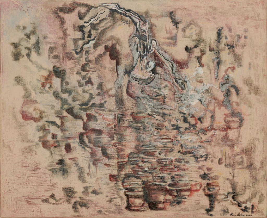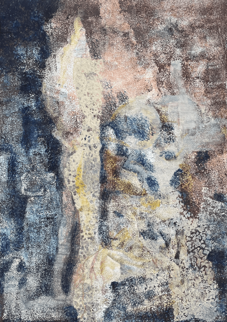 Wet grass bleached my shoes (after Seamus Heaney’s poem Blackberry picking), 73,5 x 60 cm, egg tempera on canvas, 2022Summer’s blood(after Seamus Heaney’s poem Blackberry picking), 60 x 73,5 cm, egg tempera and oil on canvas, 2022Like thickened wine(after Seamus Heaney’s poem Blackberry picking), 73,5 x 60 cm, egg tempera and oil on canvas, 2022Pentimento, 70 x 100 cm, egg tempera with pigments and collage on gessoed panel, 2021Lights, 60 x 80 cm, hand-printed marks with egg tempera and pigments on gessoed panel, 2021Palimpseste, 60 by 80cm, hand-printed marks with egg tempera and pigments on gessoed panel, 2021Family Shadows, 60 by 80cm, hand-printed marks with egg tempera, pigments and collages on gessoed panel, 2021Golden Ladies, 60 by 80cm, hand-printed marks with egg tempera, pigments and collages on gessoed panel, 2021